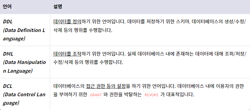 - Structed Query Language(SQL): RDBMS의 데이터를 정의하고 질의, 수정 등을 하기 위해 고안된 언어