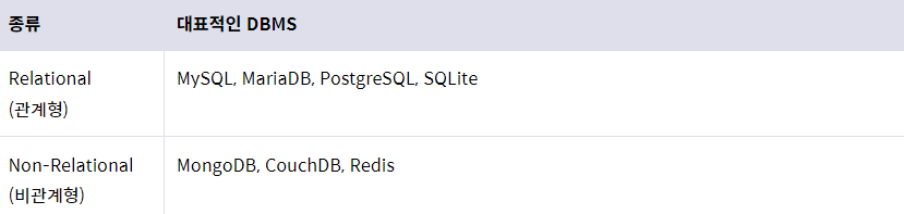 - DBMS는 관계형과 비관계형을 기준으로 분류하며, 다양한 종류의 DBMS가 존재