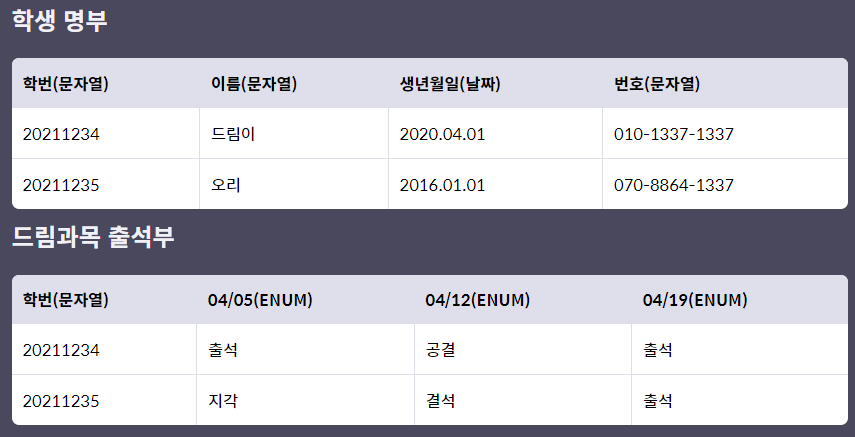 각 테이블의 정보를 사용할 때에는 학번(학생들의 고유 키)을 참조해 사용