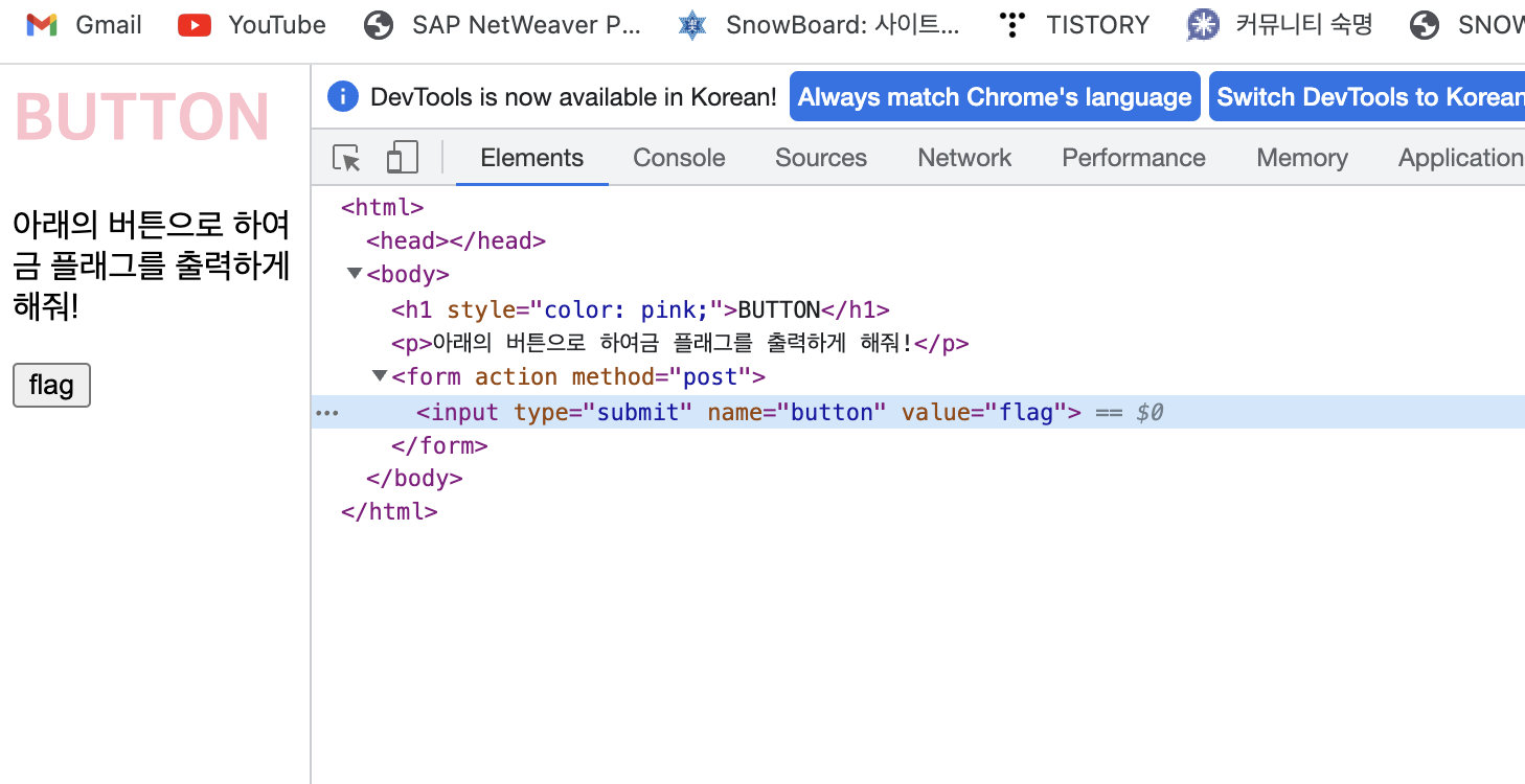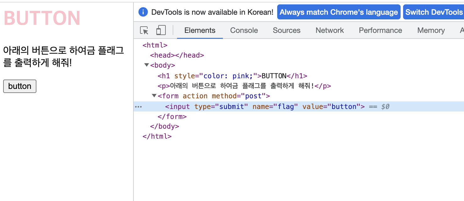 이 상태에서 버튼을 누르면 "button" 대신 "flag"가 전송될 것이다